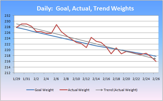 Still, I can celebrate the fact that in 7 weeks, I have lost 22.8 pounds. That is counting back to January 8, the first Saturday I weighed myself. I would have to use an estimated weight to go back to when I started the diet, so I am not.