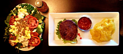 Chili (grass-fed beef, black beans, tomatoes, mushrooms, peas and spices) and Spring Mix greens, red cabbage and balsamic vinaigrette. |